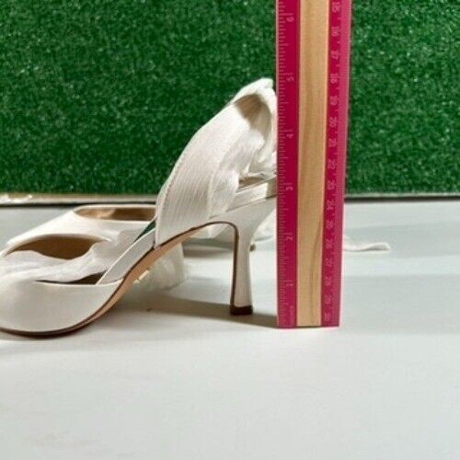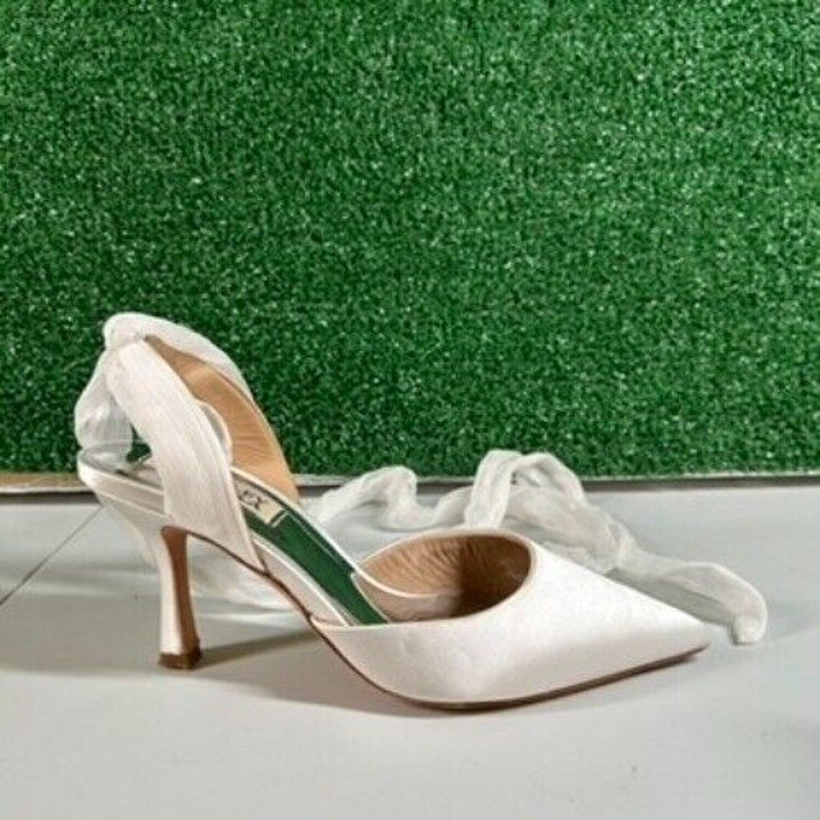 Keywords: Badgley Mischka heels, white satin heels, pointed toe pumps, ankle wrap heels, stiletto heels, wedding heels, formal shoes, women's heels, designer heels, elegant pumps, party heels, special occasion shoes, bridal heels, white pumps